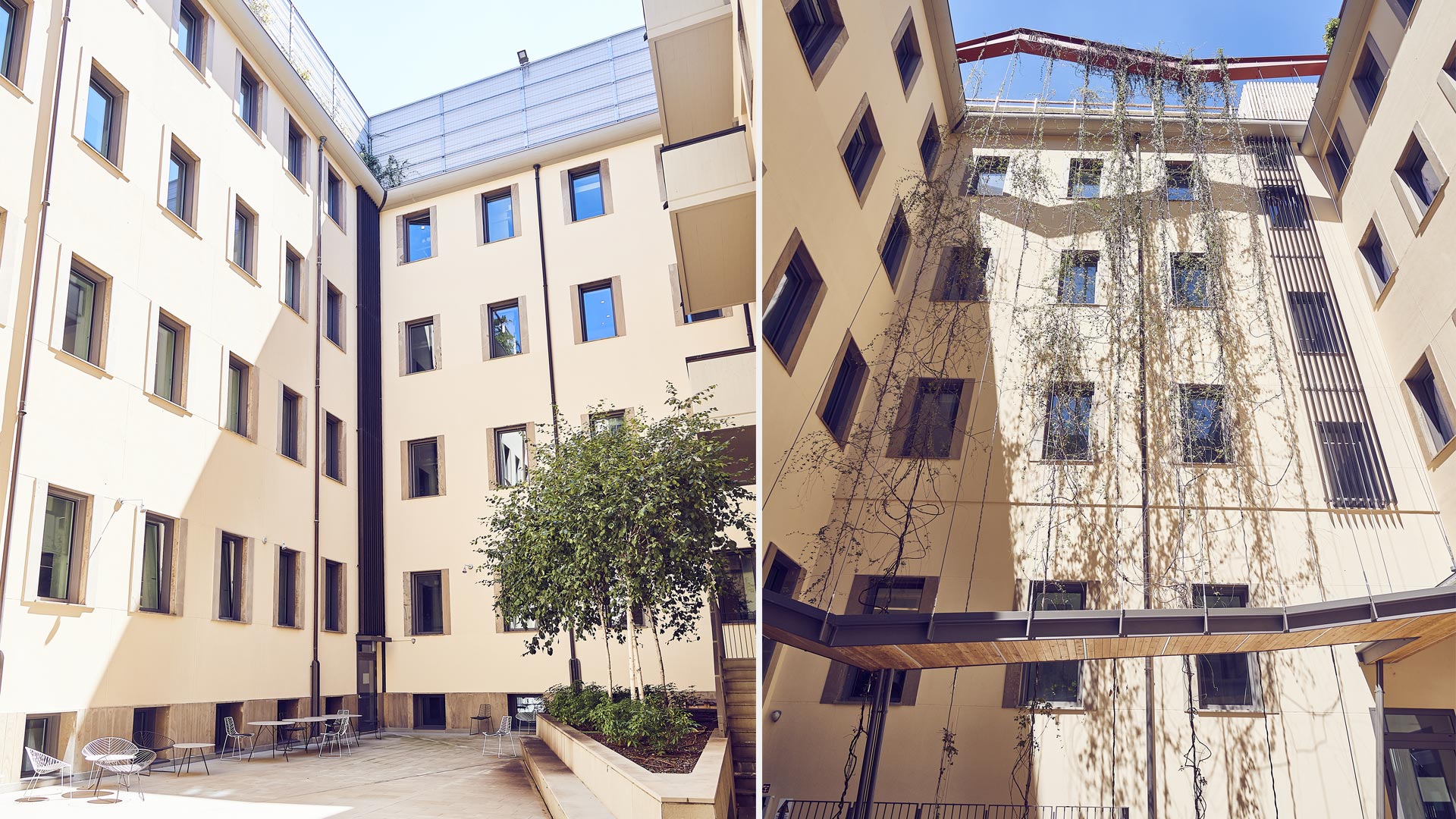 I corpi vetrati al terzo piano risultanti dalla sopraelevazione, abbelliti da pergole, rampicanti e piccole zone a prato verso il cortile, ospitano spazi dedicati ad attività di team, al relax e al fitness. La scelta delle essenze sul tetto e lungo le facciate interne è orientata all’esigenza di favorire il benessere psicofisico dei dipendenti, un valore prioritario per il nuovo tenant. Il loro effetto è quello di alleggerire le facciate massicce del complesso rendendo l’intervento ben calibrato e in sintonia con il presente.
