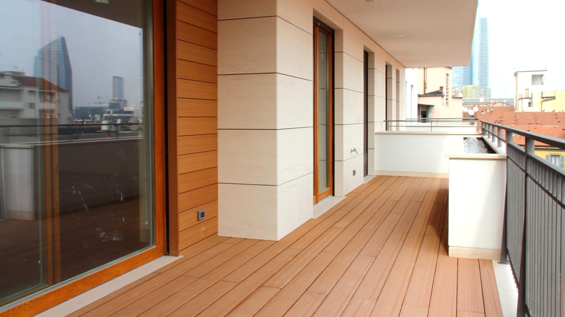 L’edificio su via Solferino, di 5 piani fuori terra, si distingue per il caldo rivestimento in pietra levigata e la facciata compatta movimentata da balconi e logge al primo e all’ultimo piano.