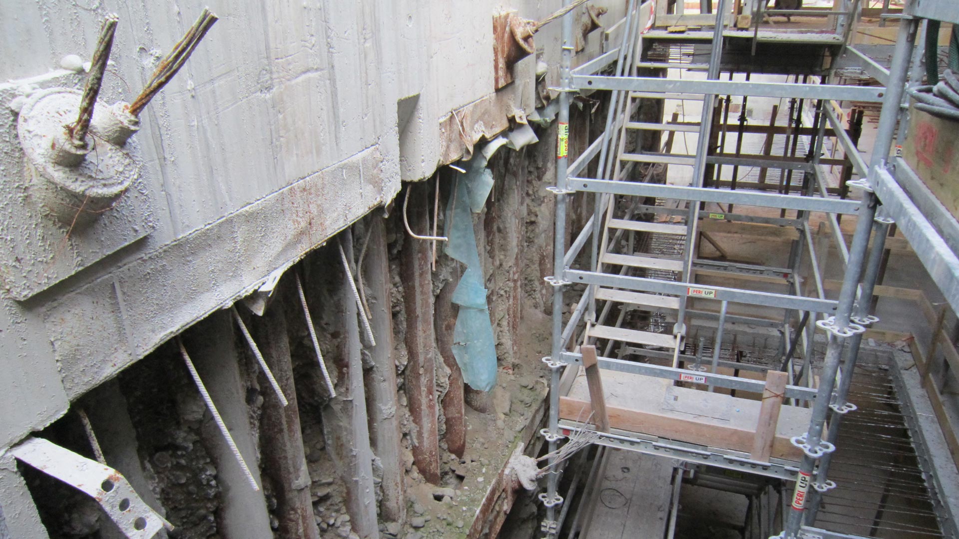 Il metodo usato consiste, dopo aver trivellato i micropali, nel procedere con lo scavo per sezioni di altezza contenuta, in modo da evitare di dover inserire putrelle e tiranti. Prima di ogni ripresa dello scavo, contro i micropali muniti di appositi connettori si esegue un contromuro che funge da ripartitore in luogo della putrella e nel quale si inseriscono infine i tiranti. Una volta raggiunto il fondo dello scavo si risale gettando uno dopo l’altro i solai, che si innestano in appositi raccordi speciali in acciaio già predisposti nel contromuro. Questo metodo ha permesso di risalire a grande velocità recuperando ampiamente la maggiore lentezza nello scavo.