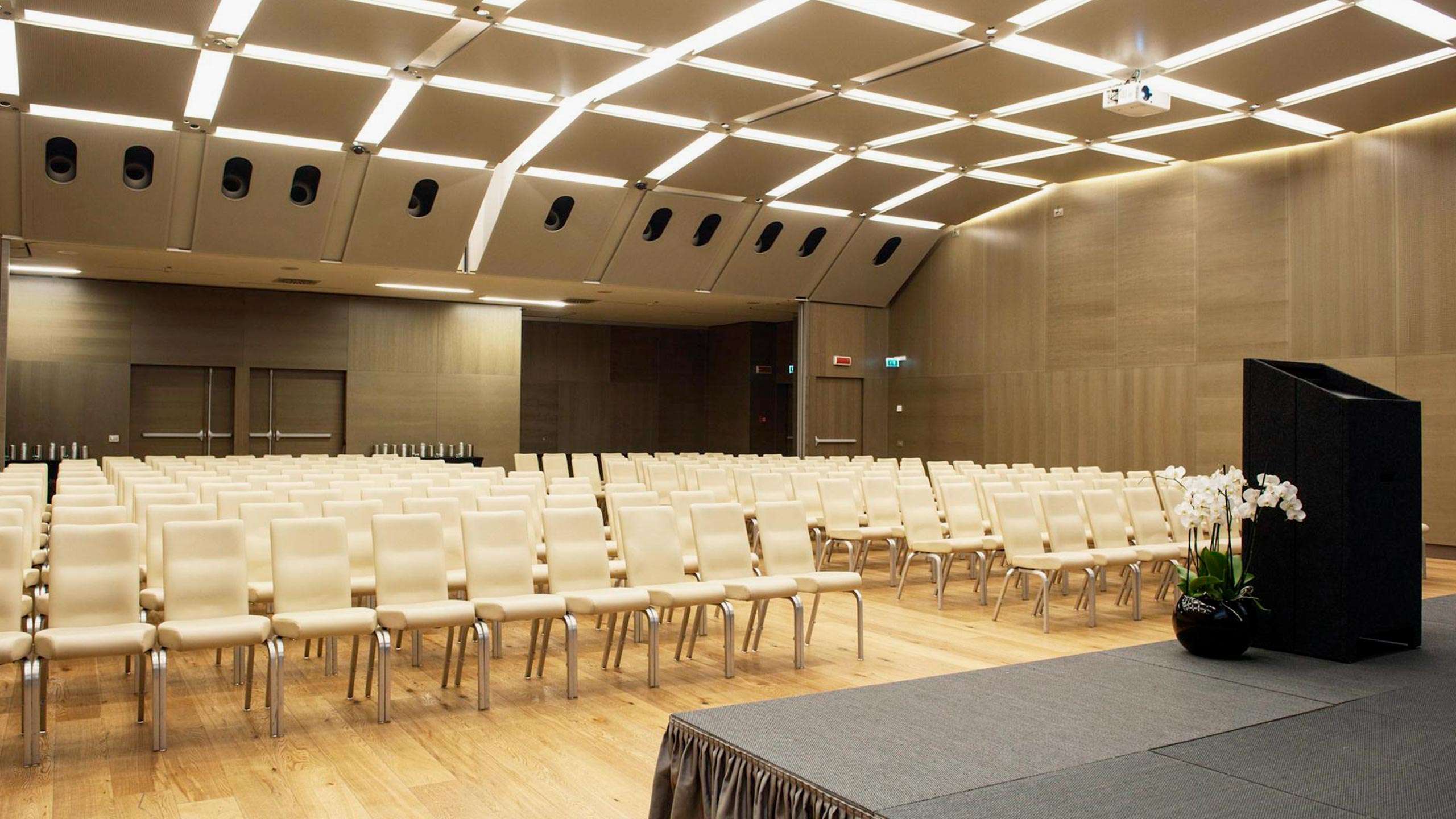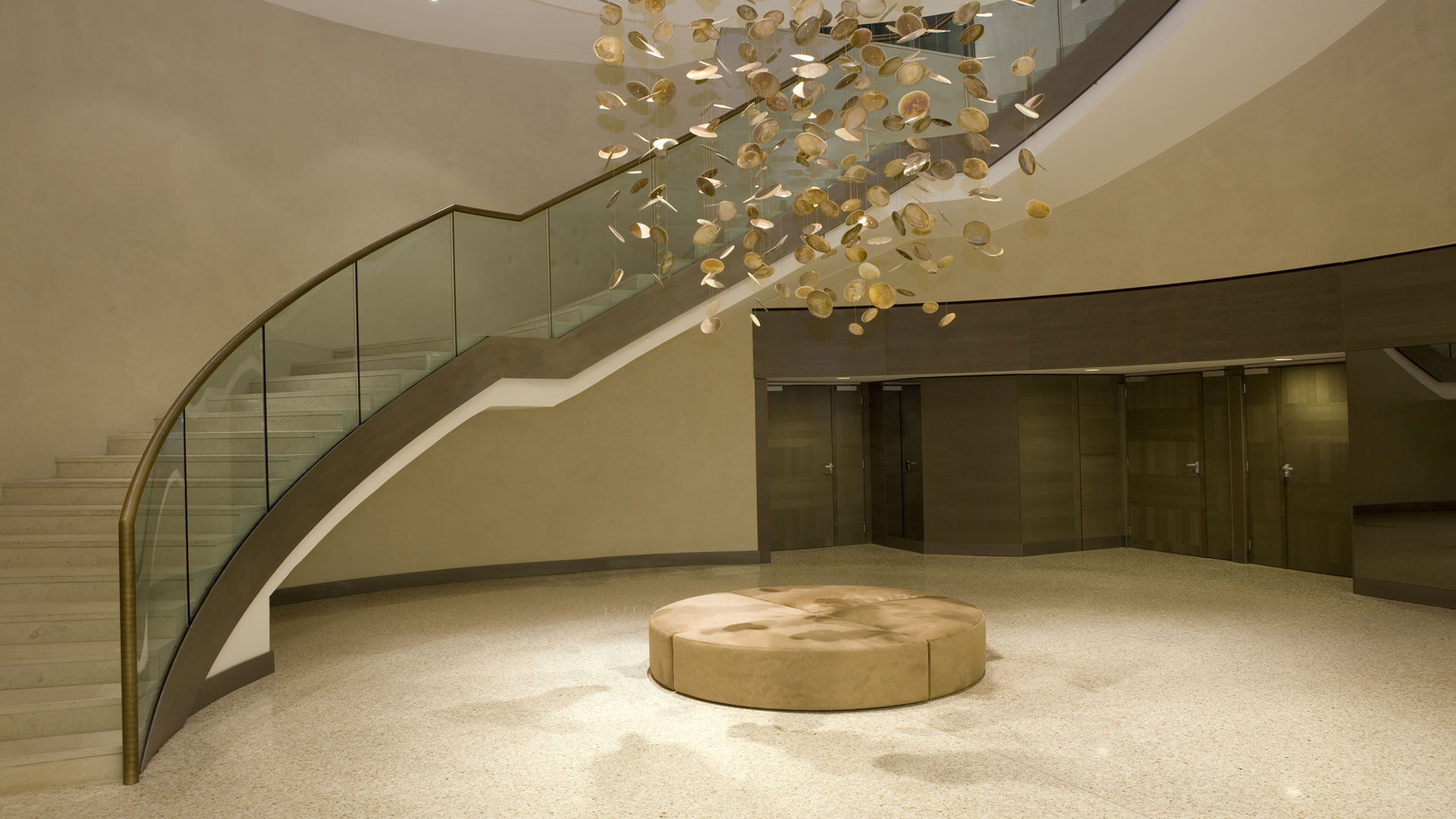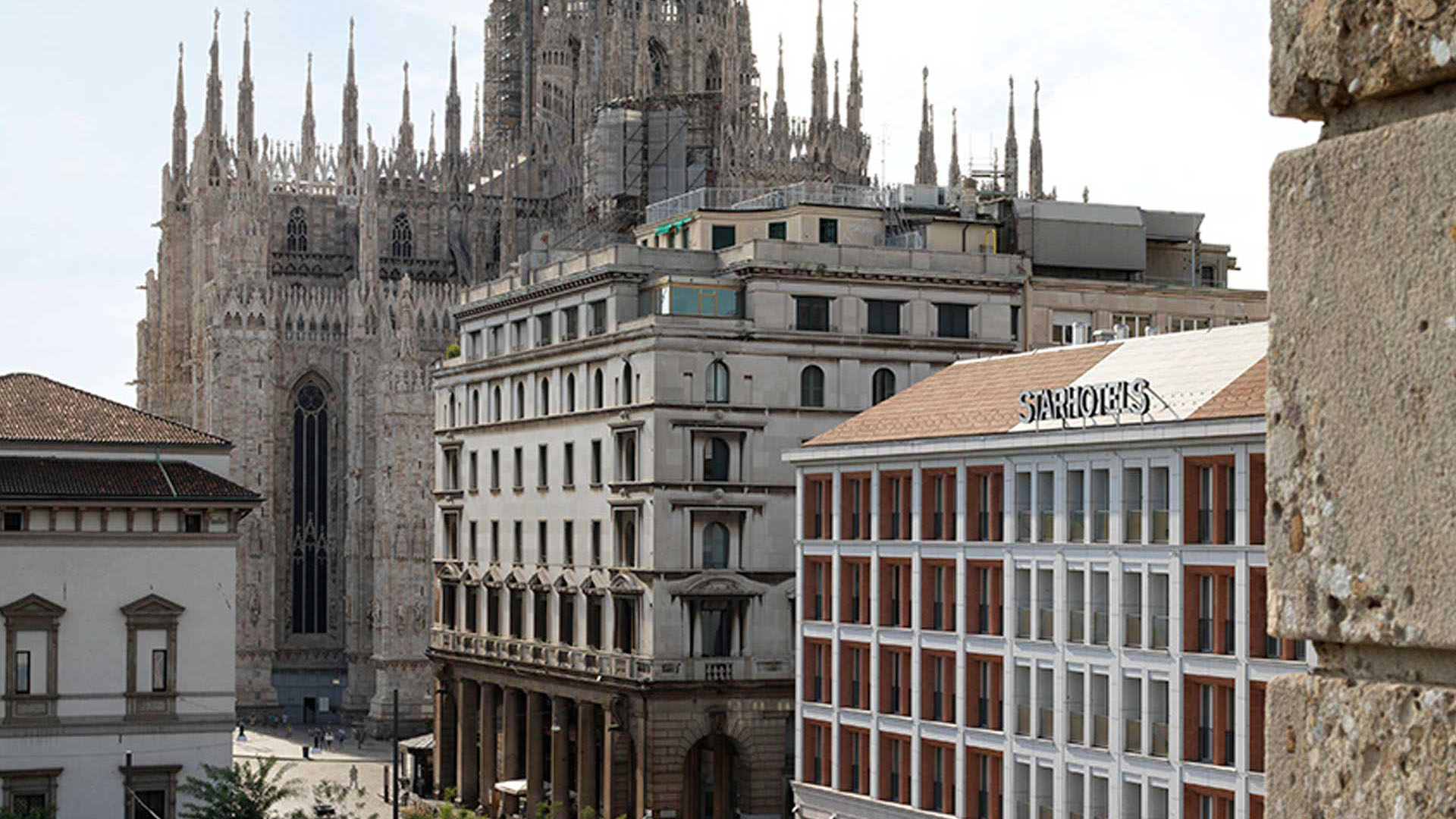 Le cortine su piazza Fontana e via Pattari, dalla partitura regolare, sono in granito rosa per il portico e bianco per i piani superiori, mentre una corte interna con un’elegante copertura vetrata crea un’ampia zona di accoglienza con la reception, gli ingressi e il ristorante. Al primo piano interrato, occupato da alcune sale congressuali, il collegamento tra i due edifici crea un percorso ad anello che agevola la circolazione interna.