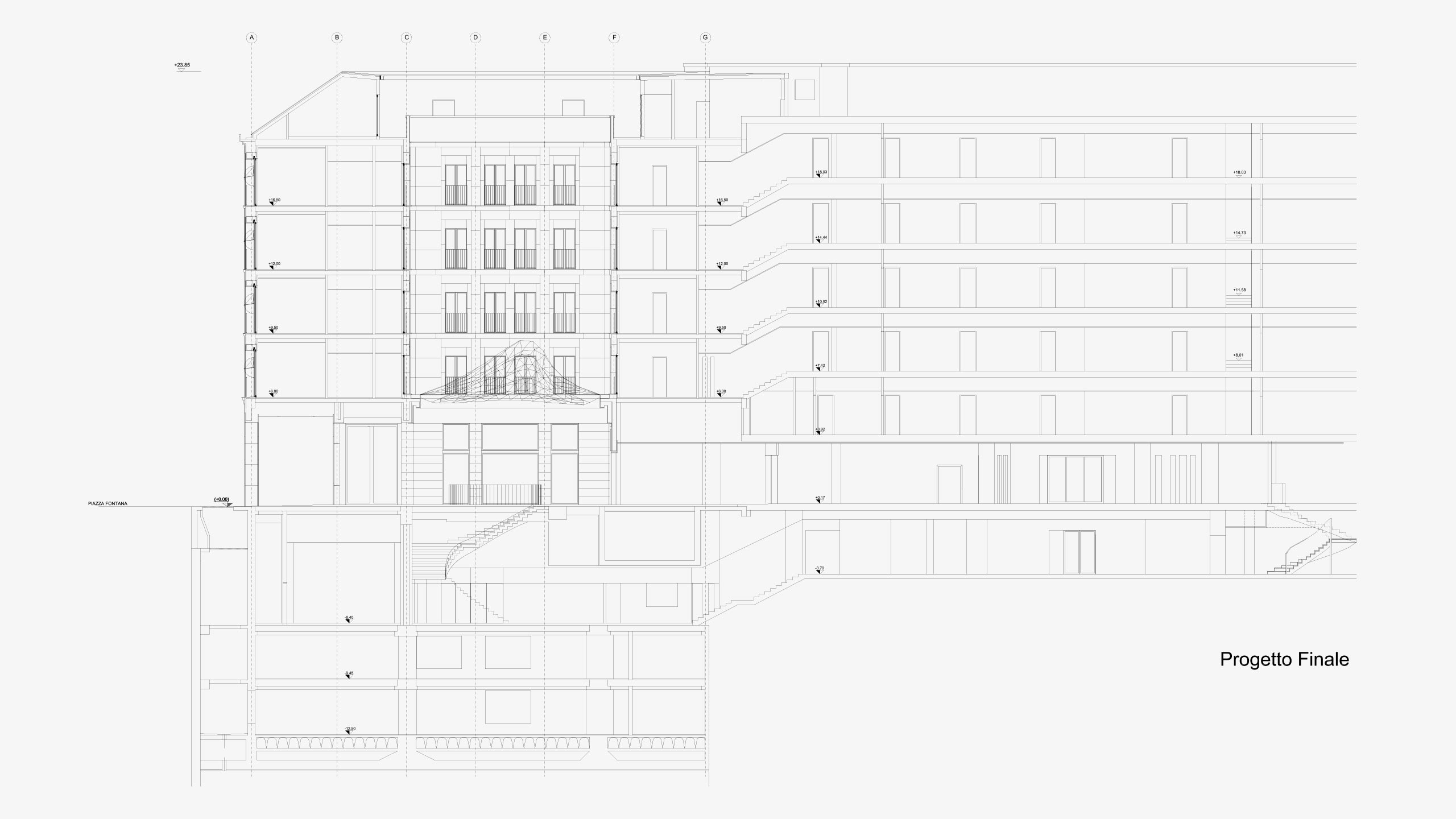 Particolare impegno ha richiesto il controllo delle opere relative all’interfaccia tra vecchio e nuovo fabbricato: dalla demolizione del muro divisorio ai vani ascensori che scendono a considerevoli profondità, dal raccordo tra le due reti impiantistiche al collegamento tra i piani terreni dei due edifici situati a quote lievemente sfalsate.