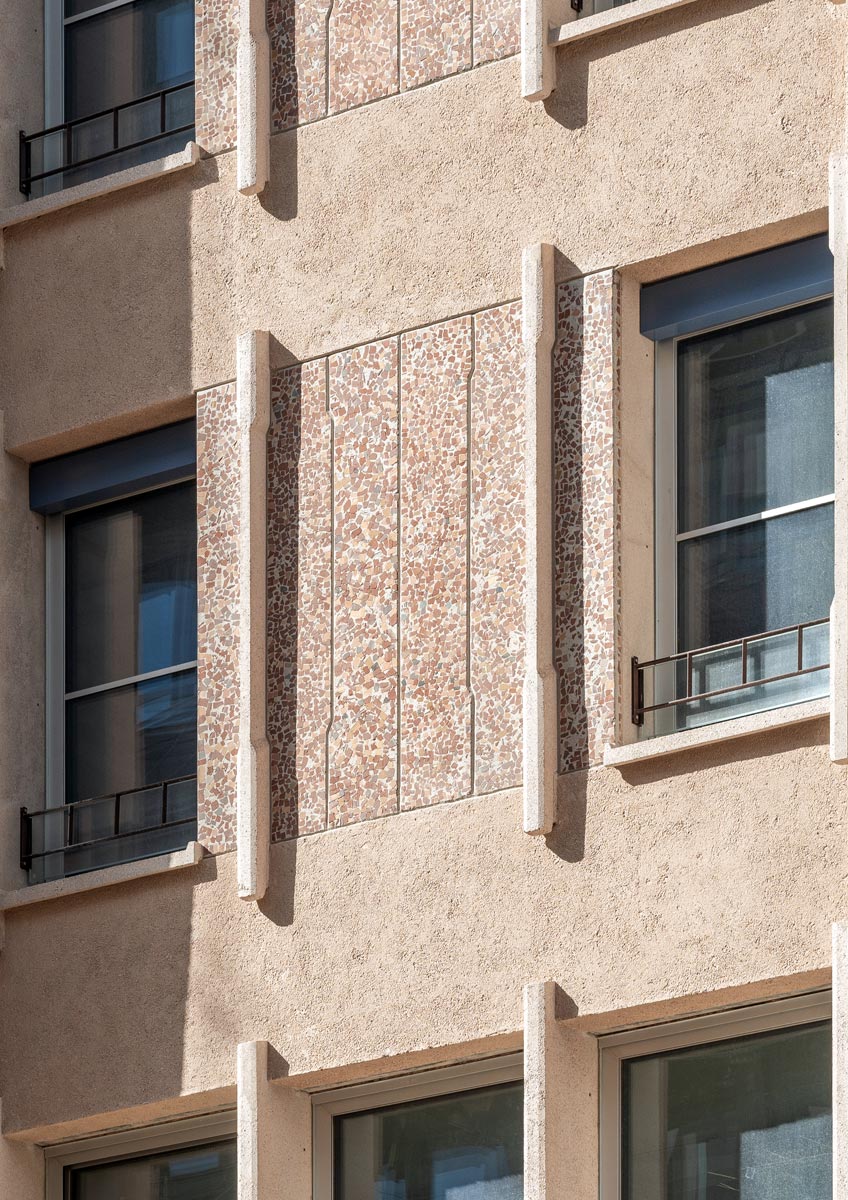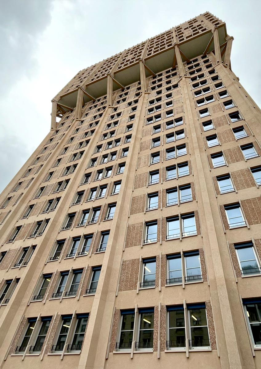 Trattandosi di un edificio storico soggetto a vincolo dal 2012, il progetto di restauro e riqualificazione è stato elaborato in sinergia con la Soprintendenza Archeologia, Belle Arti e Paesaggio. Le facciate esterne e le travature oblique del modulo superiore aggettante sono state completamente restaurate e consolidate, restituendo alle superfici in cemento e graniglia di porfido rosa i colori originali ricostruiti tramite accurate analisi storiche e materiche.